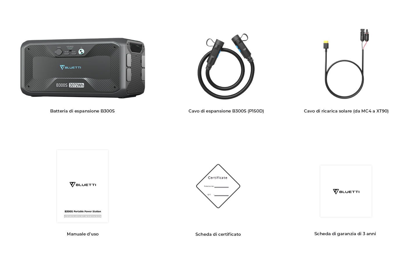 Capacità: 3,072Wh (51.2V, 60Ah) Tipo di Batteria: LiFePO4 (Fosfato di Ferro e Litio) Cicli di Vita: 3,500+ Cicli Fino all'80% della Capacità Originale Shelf-life: Ricarica all'80% Ogni 3-6 Mesi Sistema di Gestione: Regolatore di Carica MPPT, BMS, ecc.