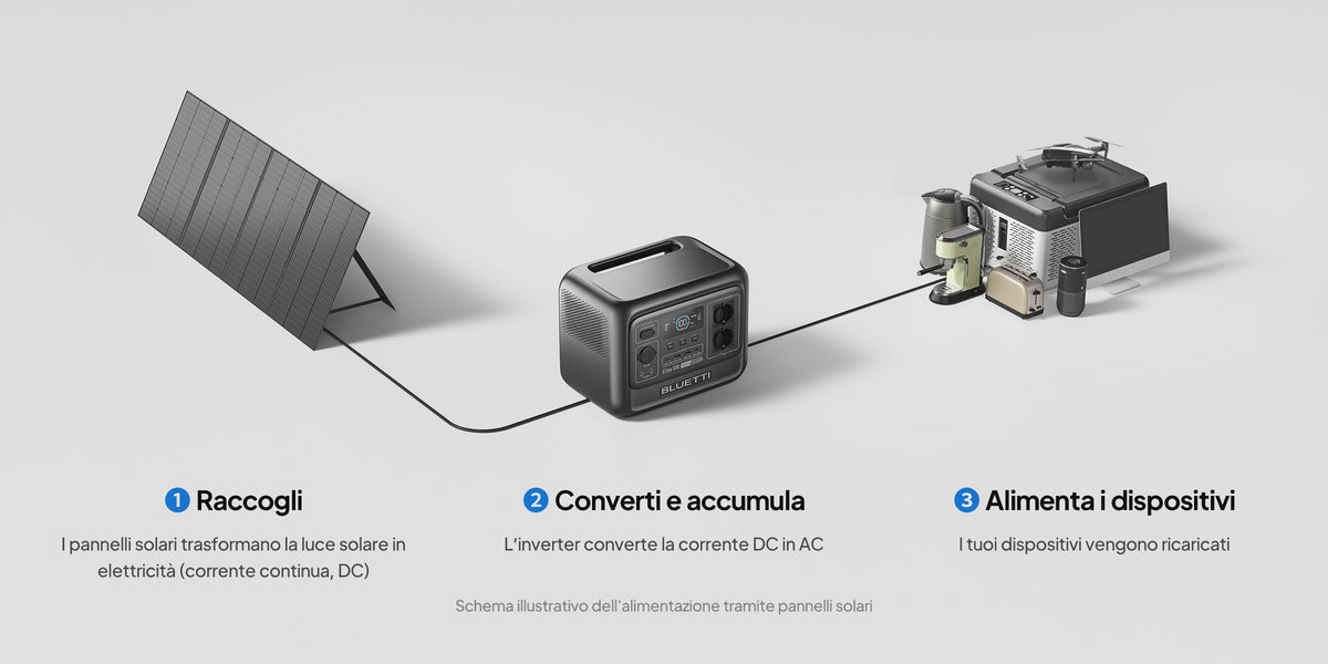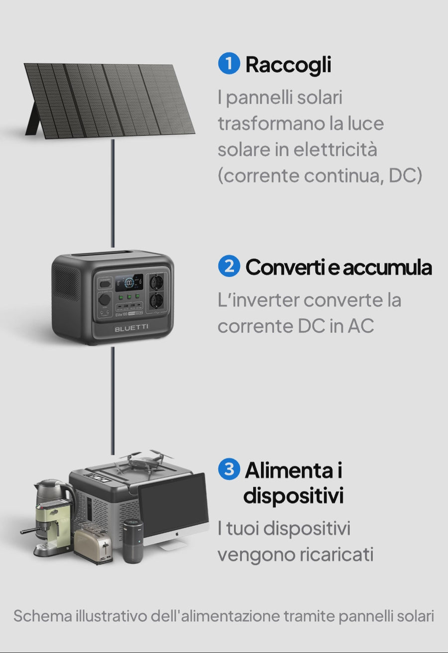 - R1: Un pannello solare cattura la luce solare e la converte in elettricità. I pannelli BLUETTI utilizzano celle monocristalline ad alta efficienza per sfruttare al meglio ogni raggio, fornendo energia affidabile ovunque ci sia il sole.