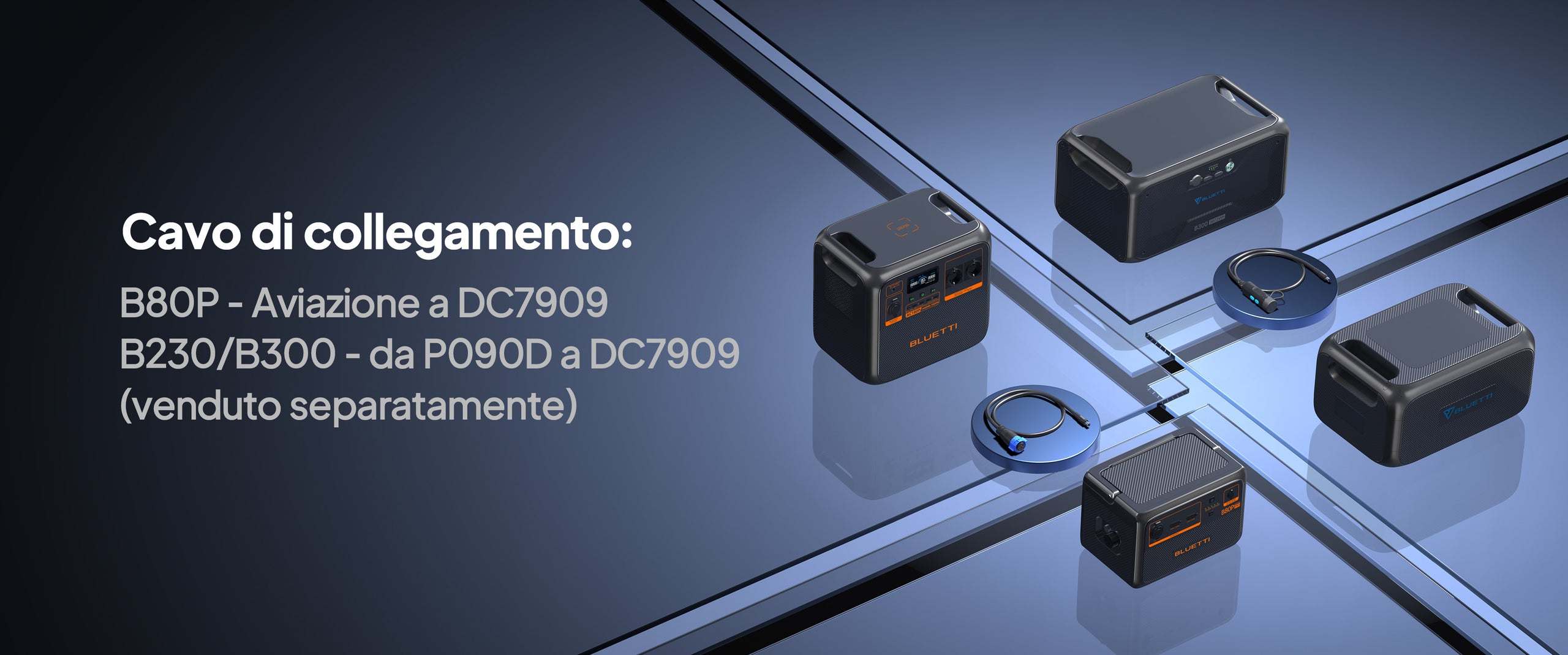 R:Attualmente, l'AC180P supporta l'espansione della capacità con batterie B80, B230 o B300. Per collegare le batterie B80, avrai bisogno del cavo da Aviation a DC7909, mentre per le batterie B230 / B300 è necessario il cavo P090D. Assicurati che le batterie siano in modalità Power Bank.