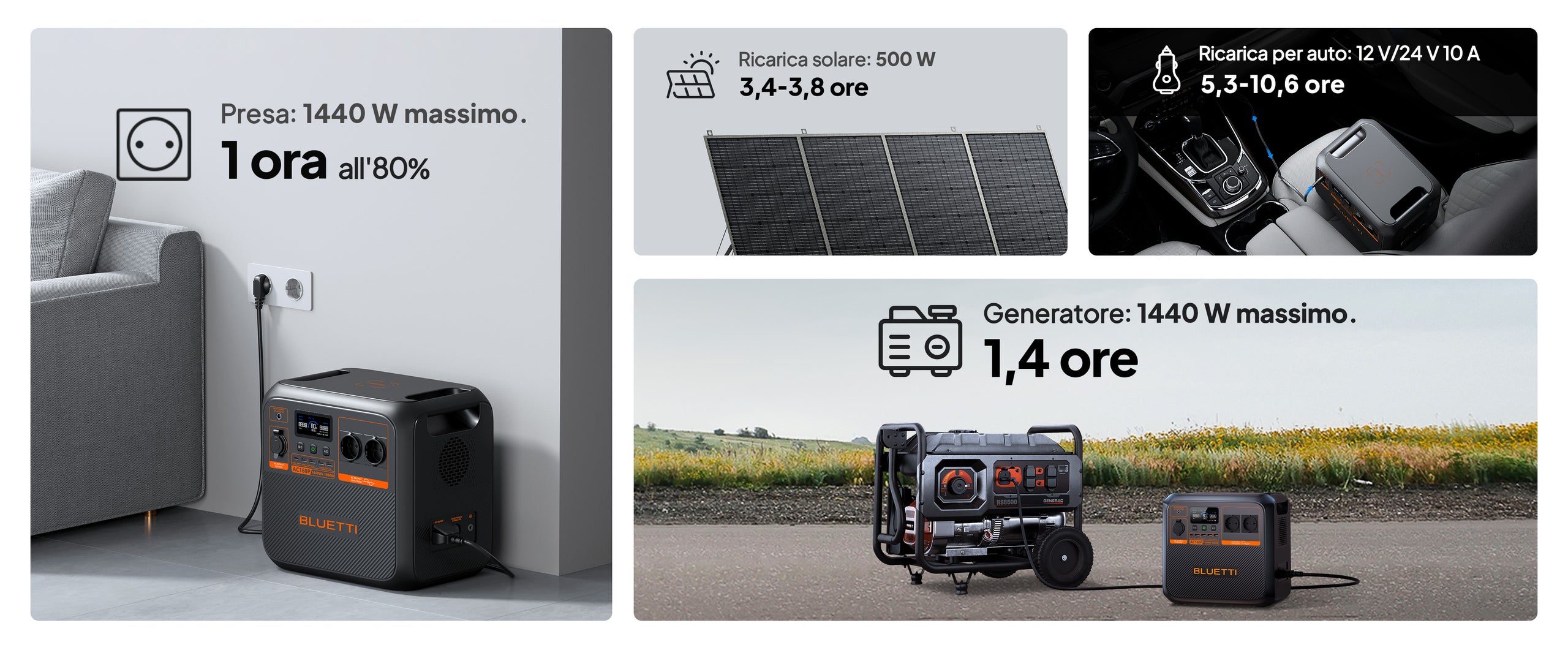 A:L'unità AC180P supporta fino a 1.440 W in ingresso. Collegandola a una presa a muro e attivando la modalità di ricarica ultrarapida sull'app BLUETTI, è possibile la ricarica in 1,3 - 1,8 ore.