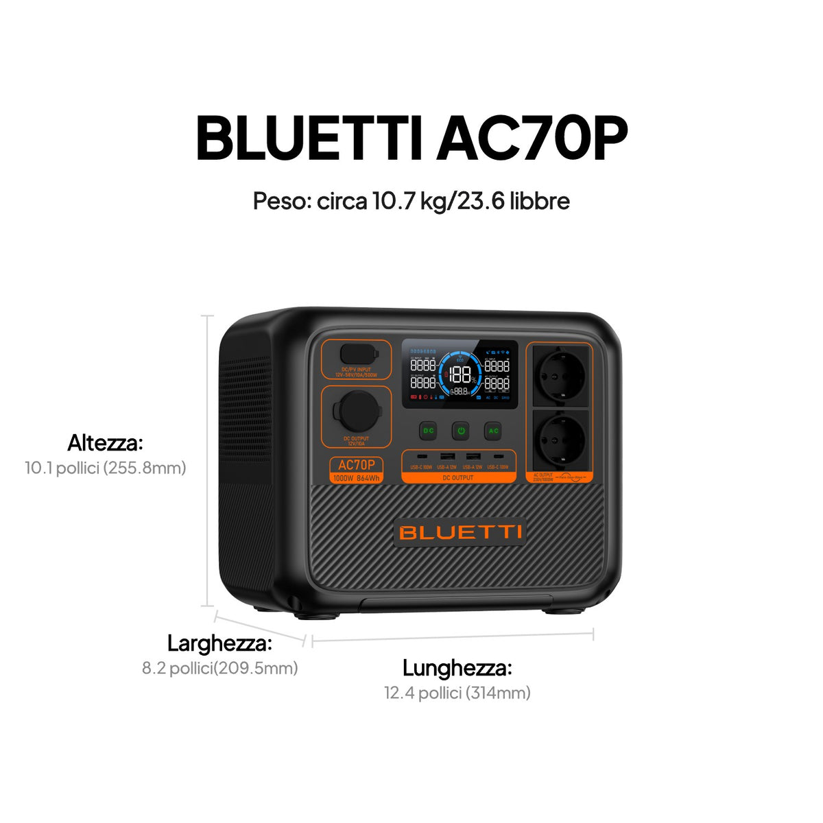 Migliora le tue soluzioni di alimentazione in movimento con la centrale elettrica BLUETTI AC70P! Dotato di una robusta capacità di 864 Wh e una potenza continua di 1.000 W, alimenta facilmente i tuoi dispositivi essenziali durante le avventure all'aria aperta, le scappatelle in camper o i momenti piacevoli a casa. Il design leggero e portatile garantisce che l'alimentazione continua sia sempre al tuo servizio ogni volta che ne hai bisogno.