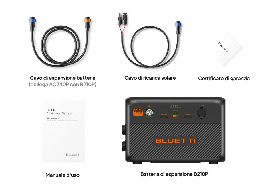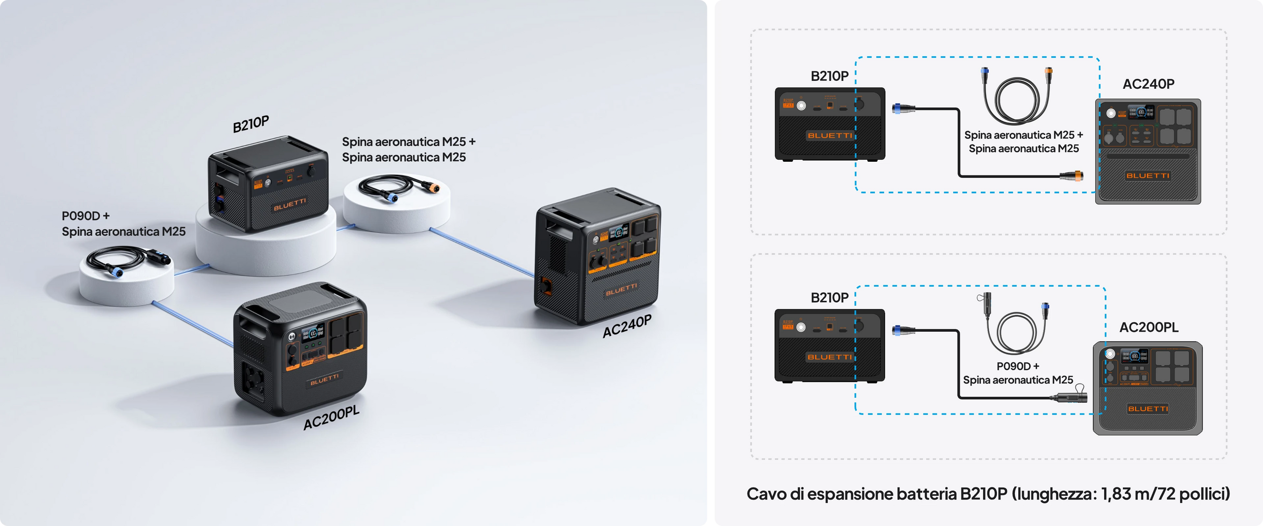 R:Come batteria di espansione, B210P è compatibile con BLUETTI AC240P e AC200PL (è necessario un cavo aggiuntivo), rispettivamente con un massimo di 4 e 2 unità.