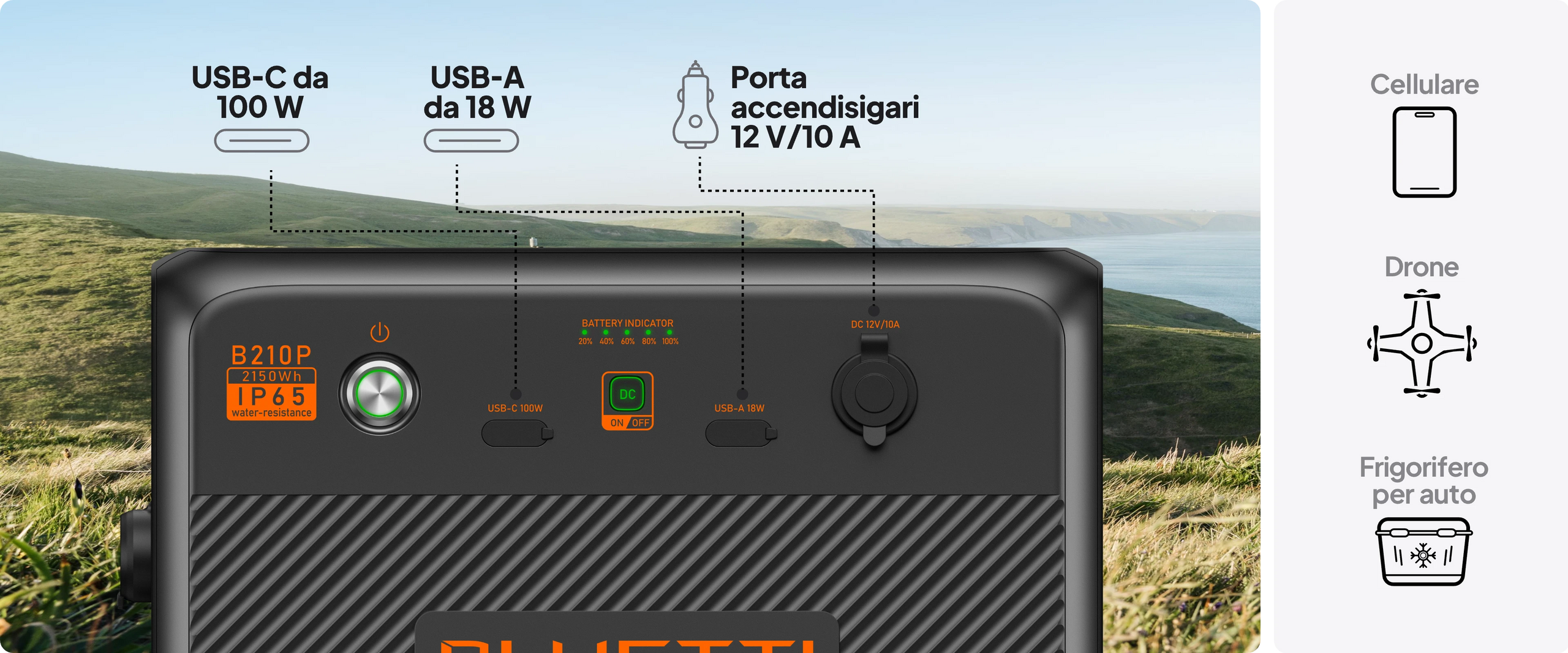 R:SÌ. B210P è una fonte di alimentazione autonoma con una porta USB-C da 100 W, una porta USB-A da 18 W e una porta per accendisigari da 12 V/10 A.