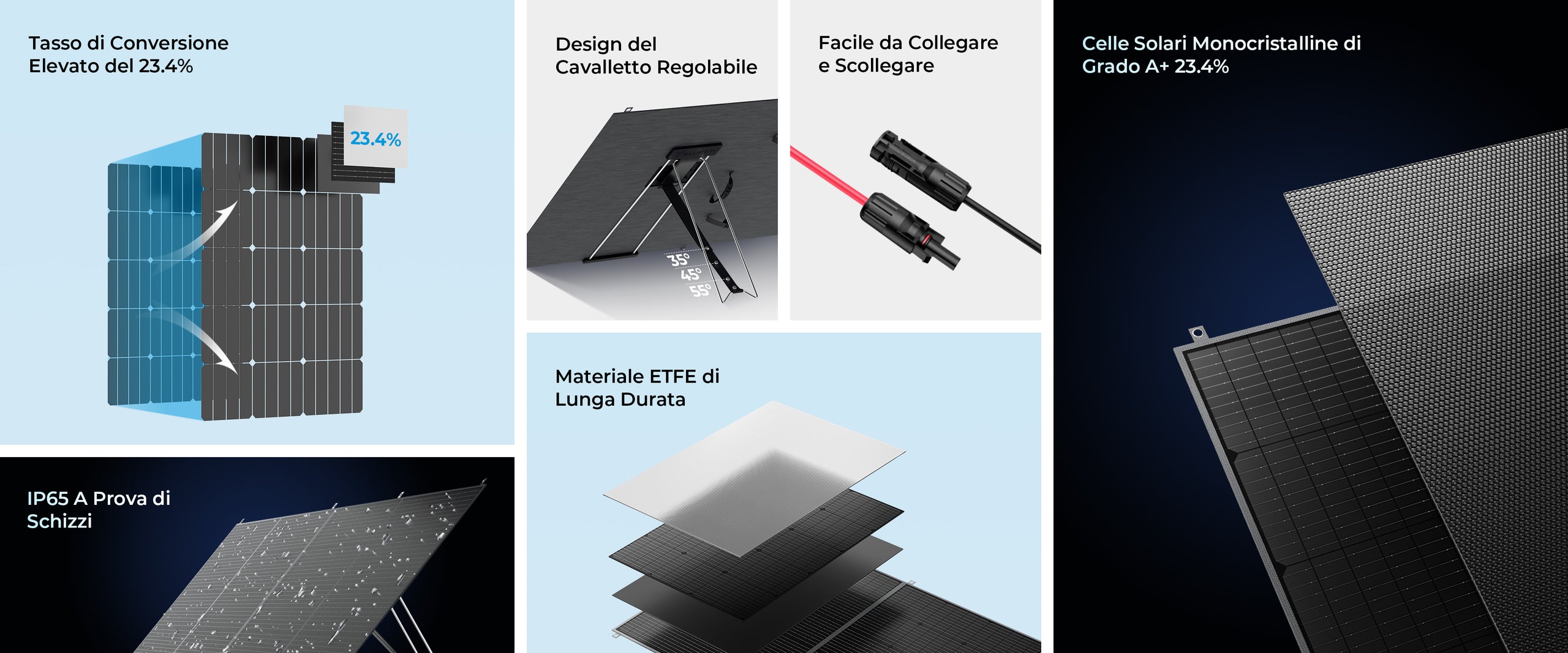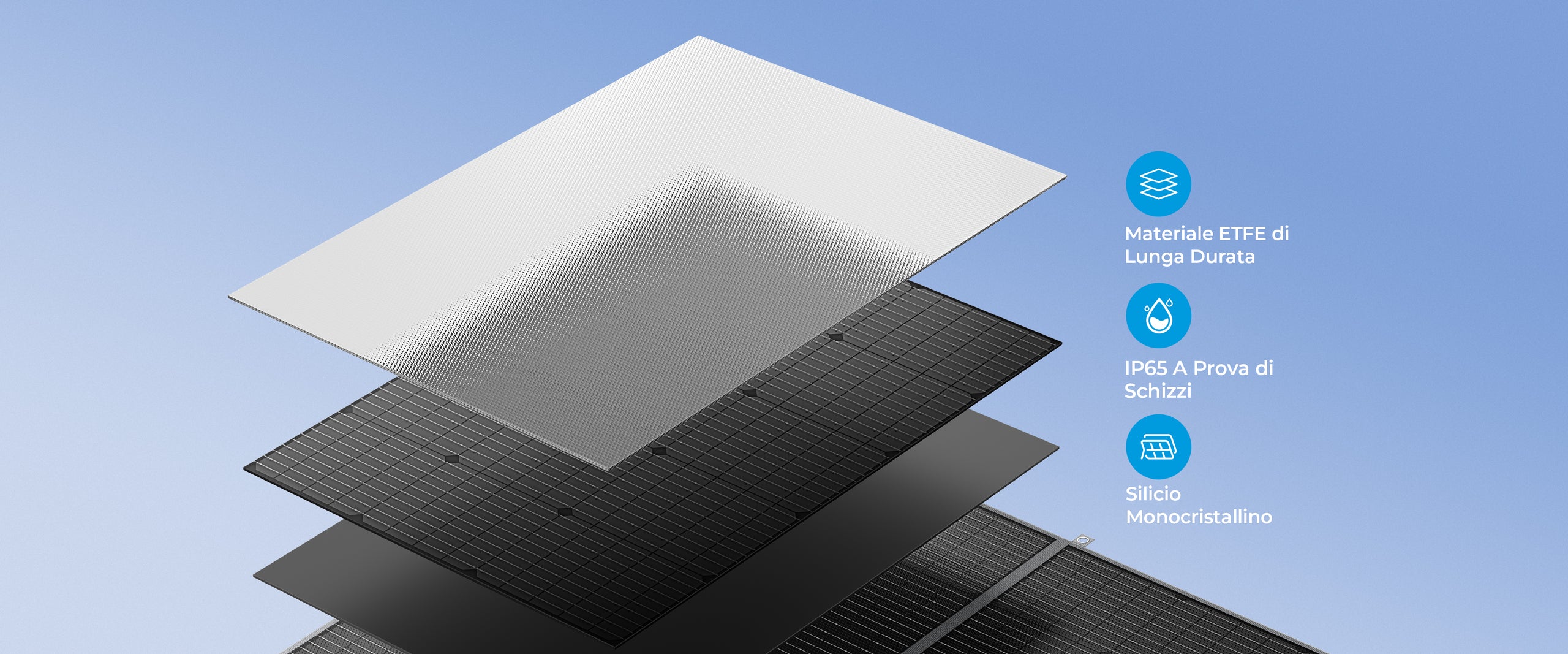 A:BLUETTI PV420 è stato sottoposto a numerosi test di affidabilità e offre un grado di resistenza all'acqua IP65. Tuttavia, per ottenere una durata ancora maggiore nell'ambiente giusto, non suggeriamo di metterli a diretto contatto con la pioggia per troppo tempo.