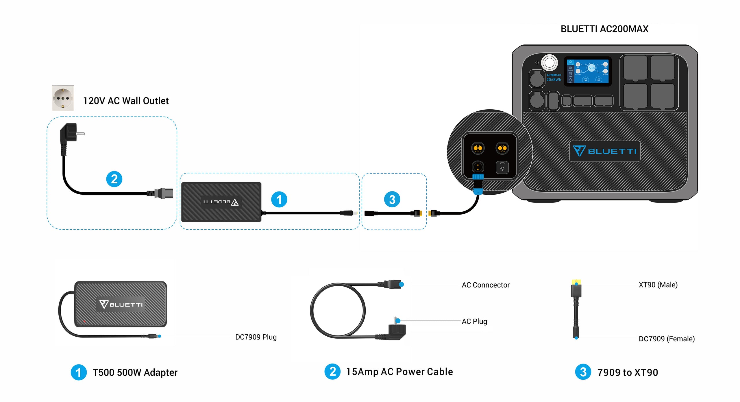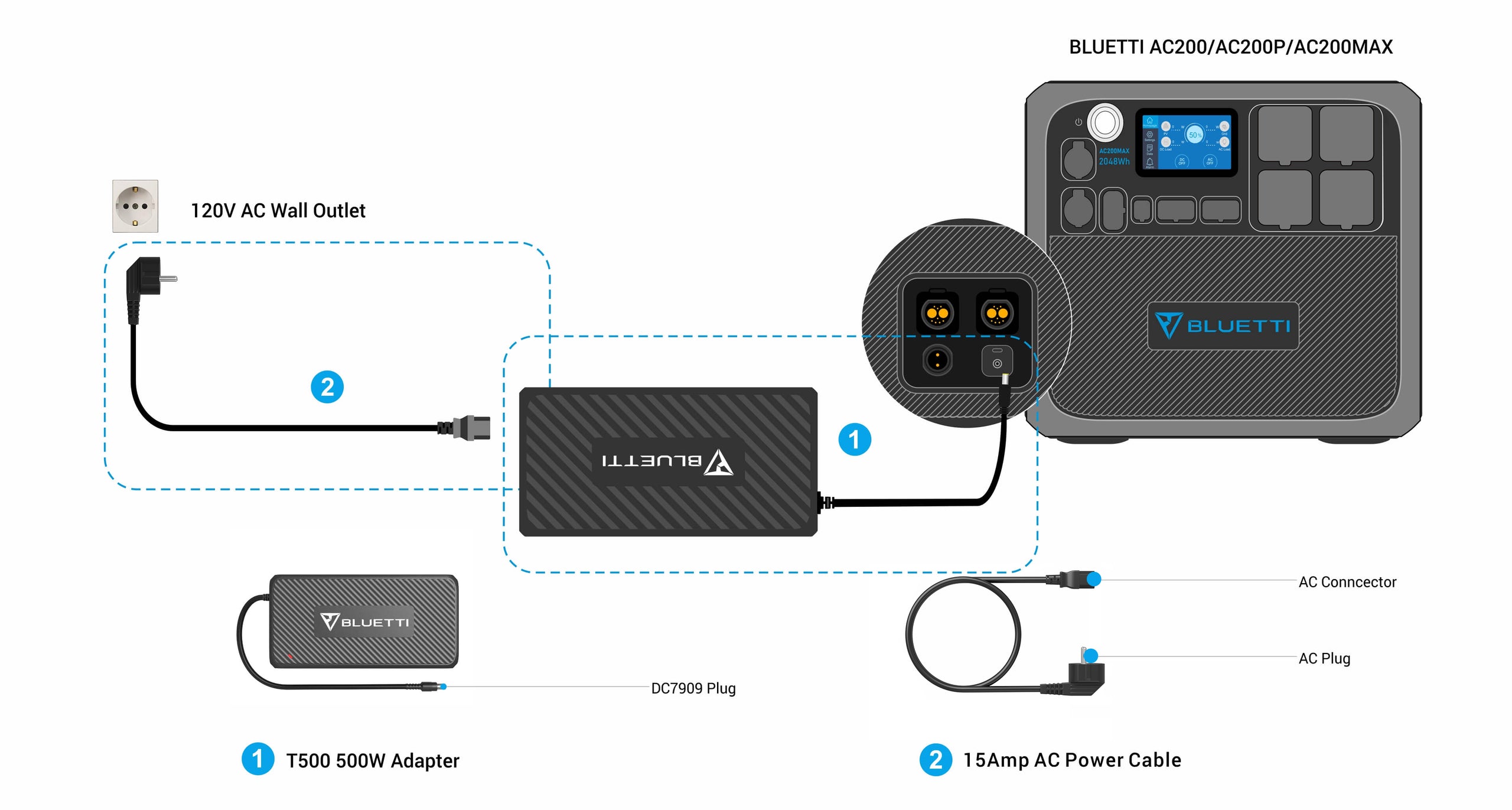 Utilizzato per caricare BLUETTI AC200P/AC200/AC200Max con doppi adattatori contemporaneamente a una velocità massima di 1000W.